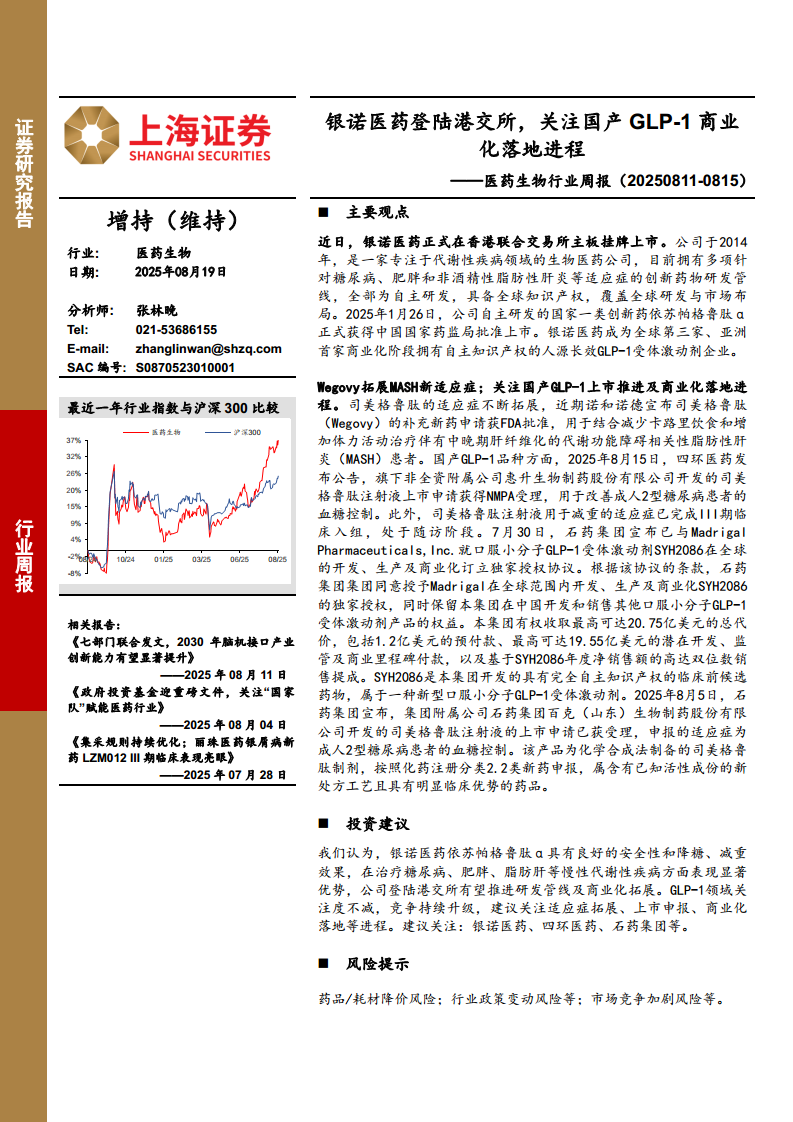 医药生物行业周报:银诺医药登陆港交所,关注国产GLP-1商业化落地进程