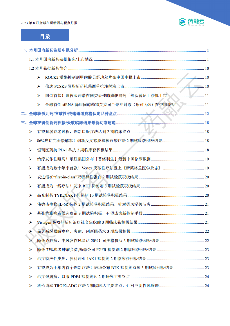 本报告根据目录,对2023年8月全球在研新药与靶点市场进行了数据分析,主要内容包括: