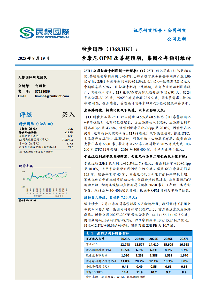特步国际(01368):索康尼OPM改善超预期,集团全年指引维持