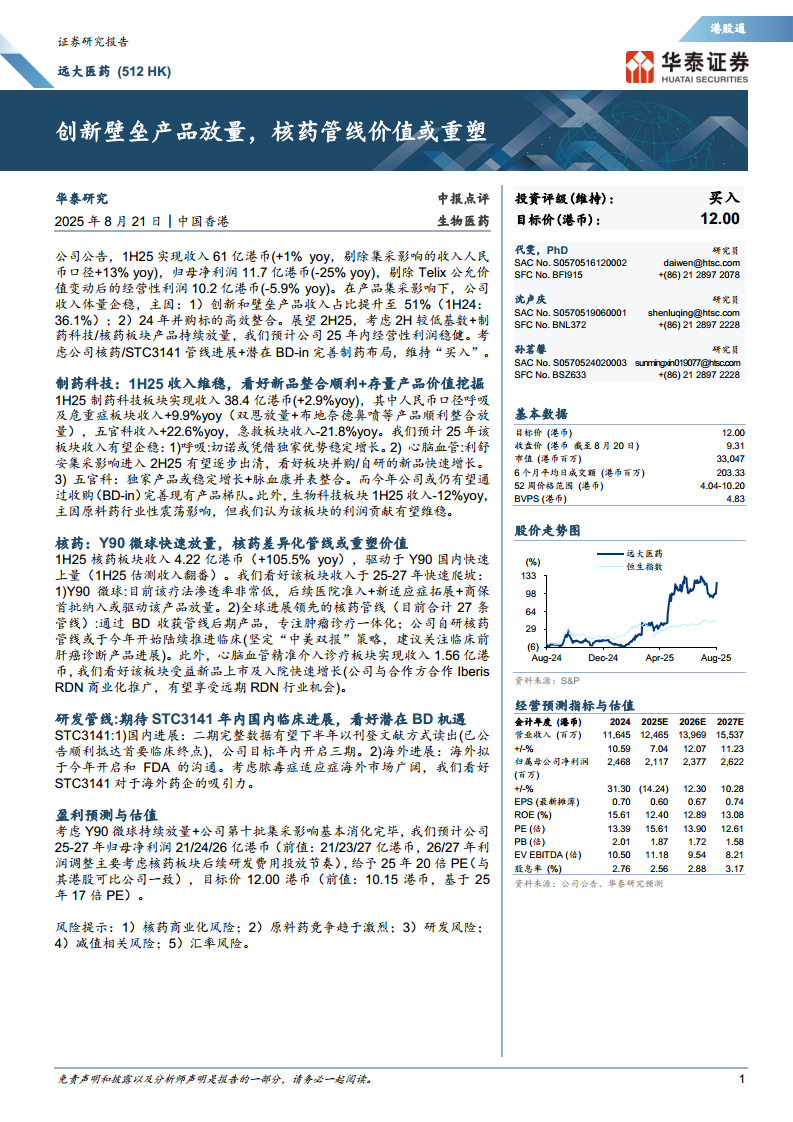 远大医药(00512):创新壁垒产品放量,核药管线价值或重塑