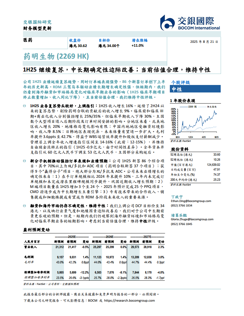 药明生物(02269):1H25继续复苏,中长期确定性边际改善;当前估值合理,维持中性