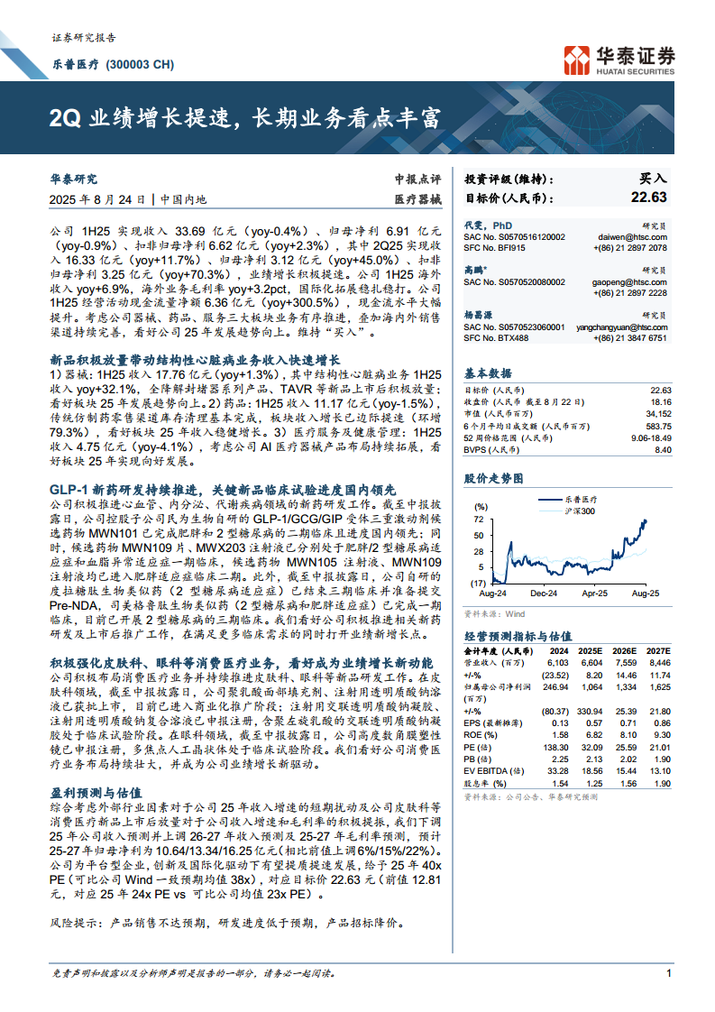 乐普医疗(300003):2Q业绩增长提速,长期业务看点丰富