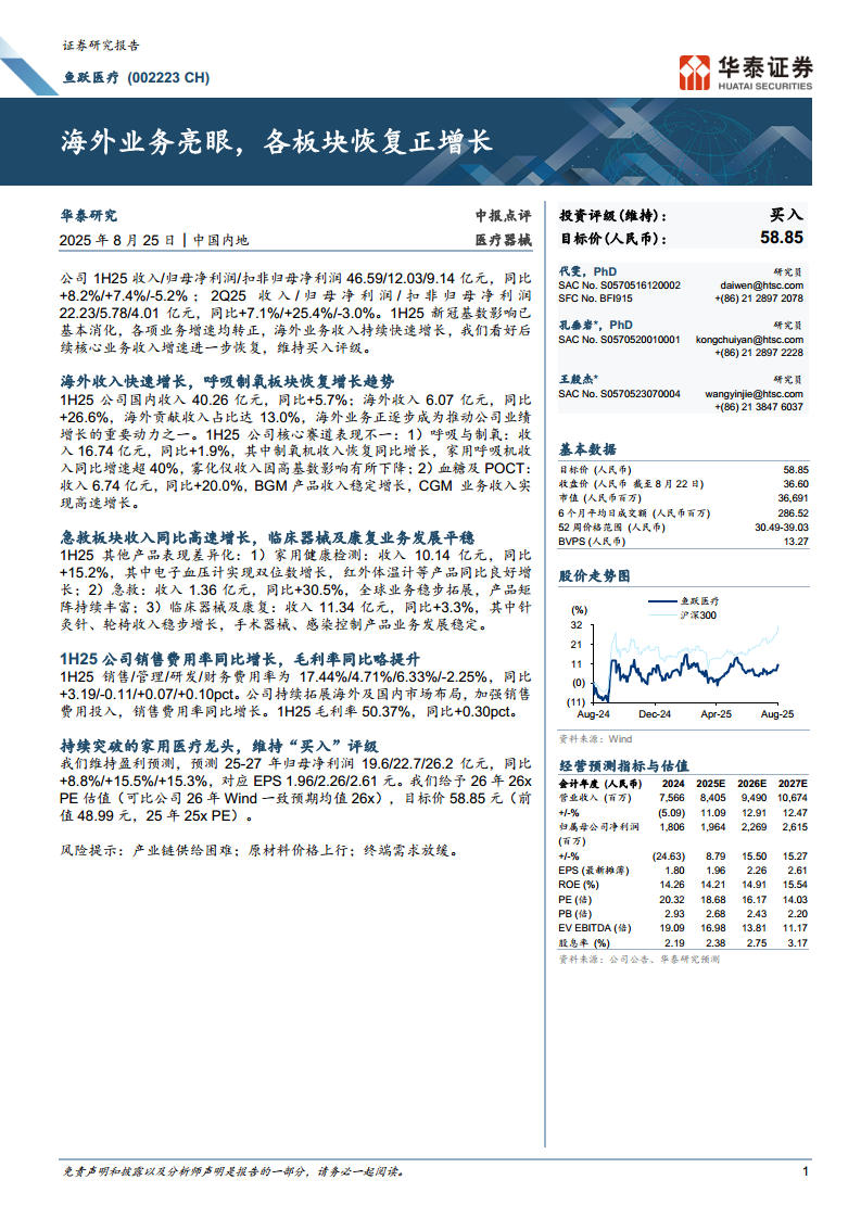 鱼跃医疗(002223):海外业务亮眼,各板块恢复正增长