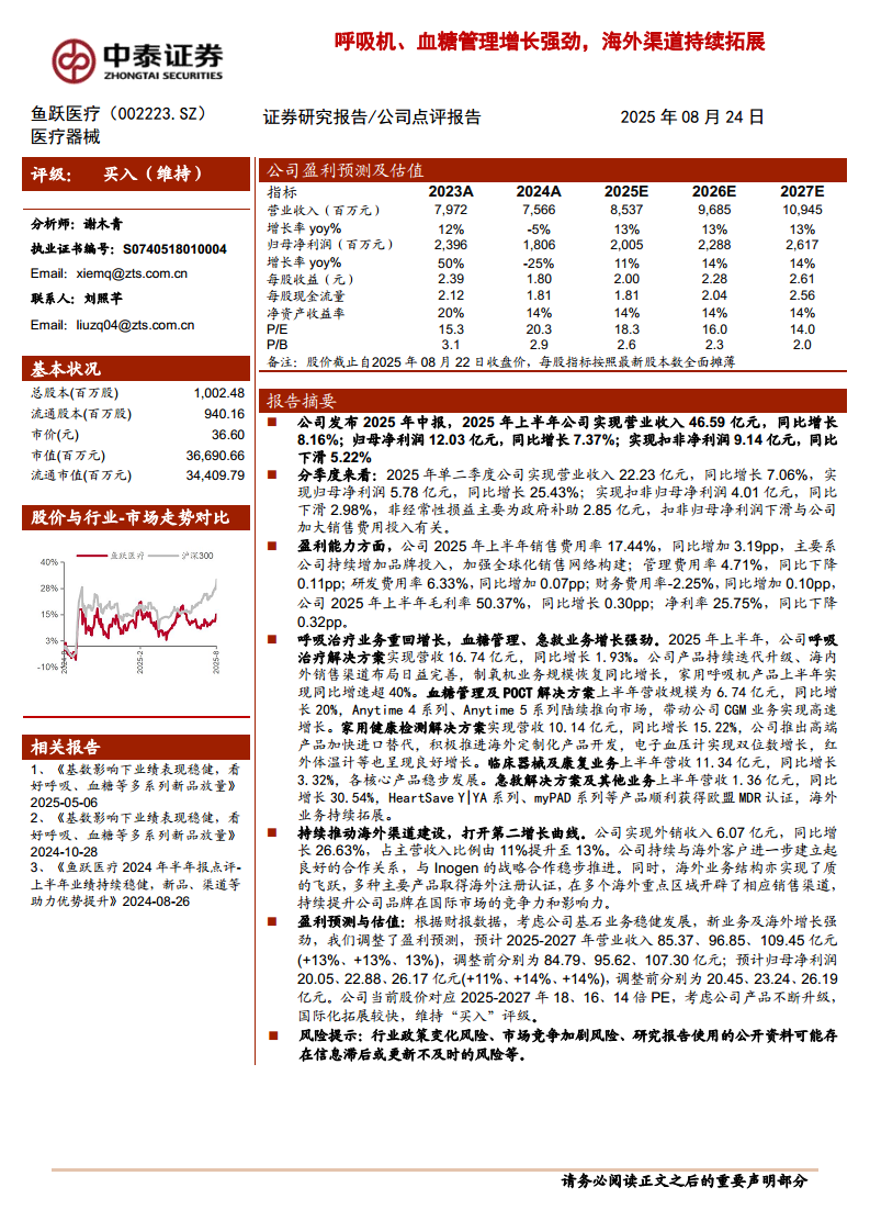 鱼跃医疗(002223):呼吸机、血糖管理增长强劲,海外渠道持续拓展