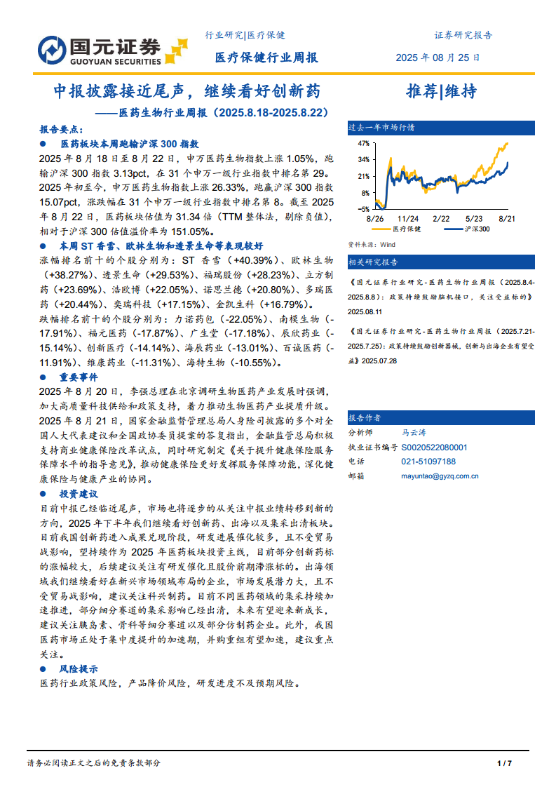 2025年8月20日,李强总理在北京调研生物医药产业发展时强调,加大高质量科技供给和政策支持,着力推动生物医药产业提质升级。2025年8月21日,国家金融监督管理总局人身险司披露的多个对全国人大代表建议和全国政协委员提案的答复指出,金融监管总局积极支持商业健康保险改革试点,同时研究制定《关于提升健康保险服务保障水平的指导意见》,推动健康保险更好发挥服务保障功能,深化健康保险与健康产业的协同。