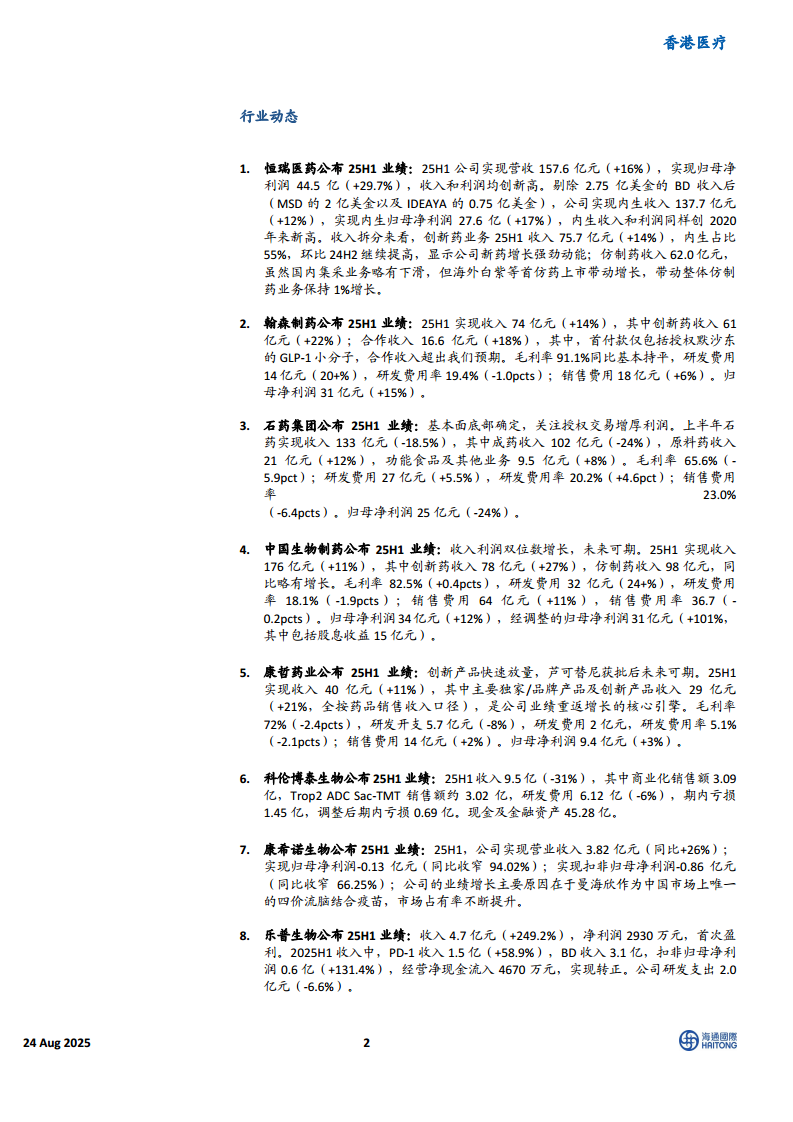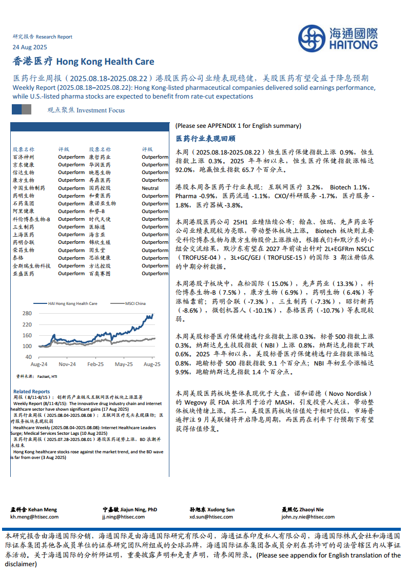 港股医药公司业绩表现稳健,美股医药有望受益于降息预期