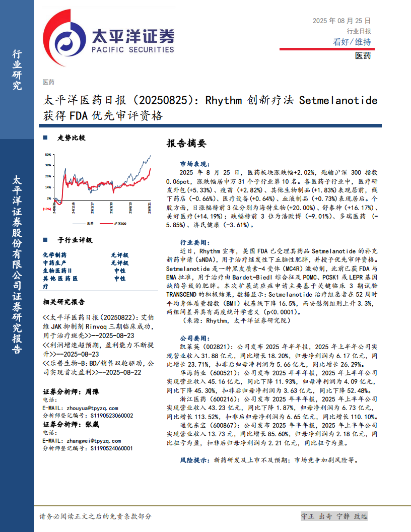 太平洋医药日报:Rhythm创新疗法Setmelanotide获得FDA优先审评资格