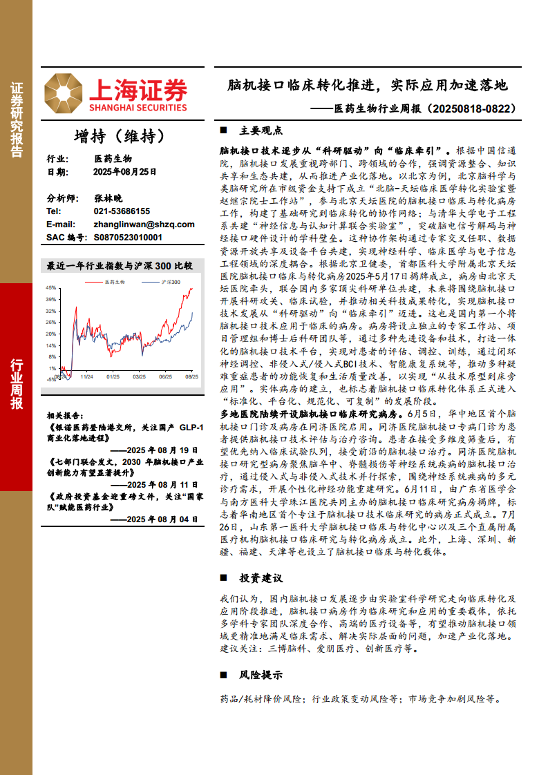 医药生物行业周报:脑机接口临床转化推进,实际应用加速落地