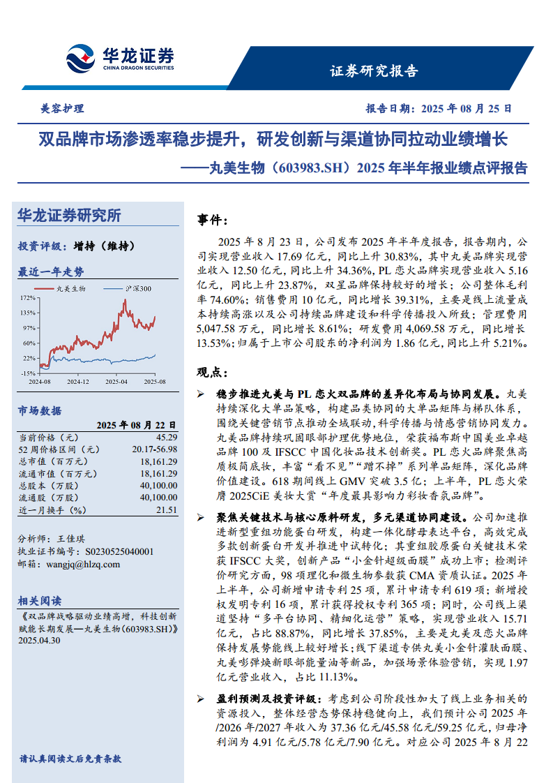 丸美生物(603983):双品牌市场渗透率稳步提升,研发创新与渠道协同拉动业绩增长