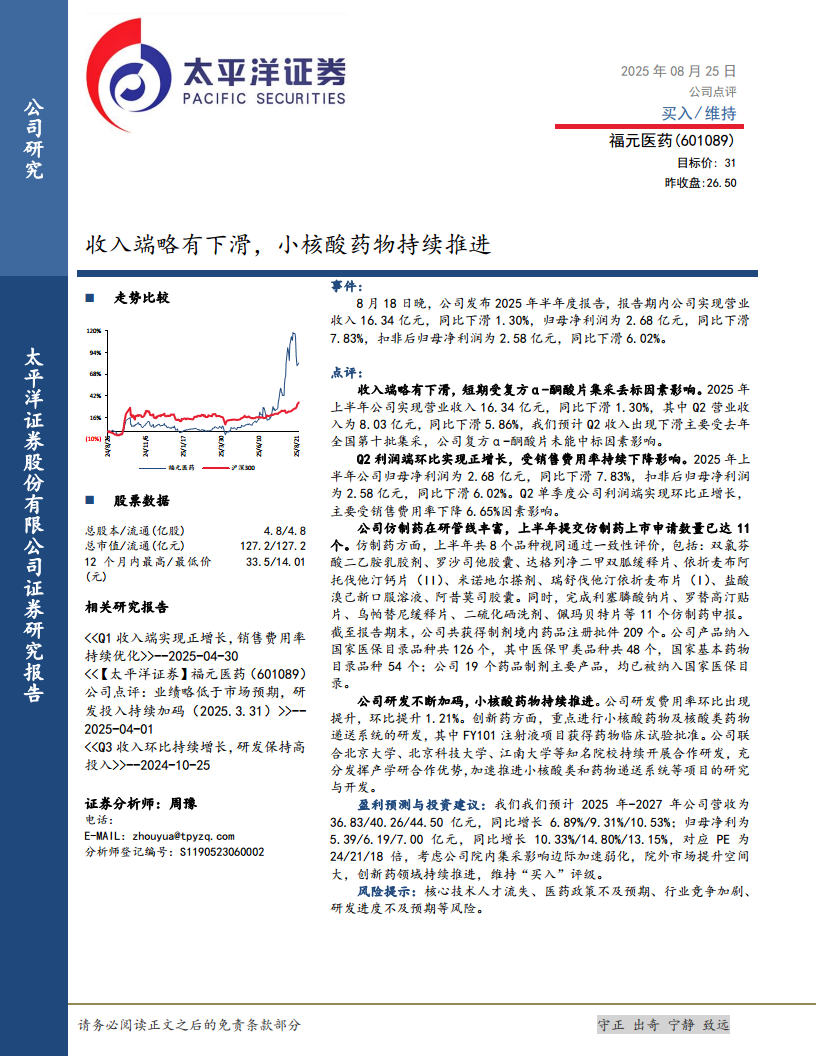 福元医药(601089):收入端略有下滑,小核酸药物持续推进