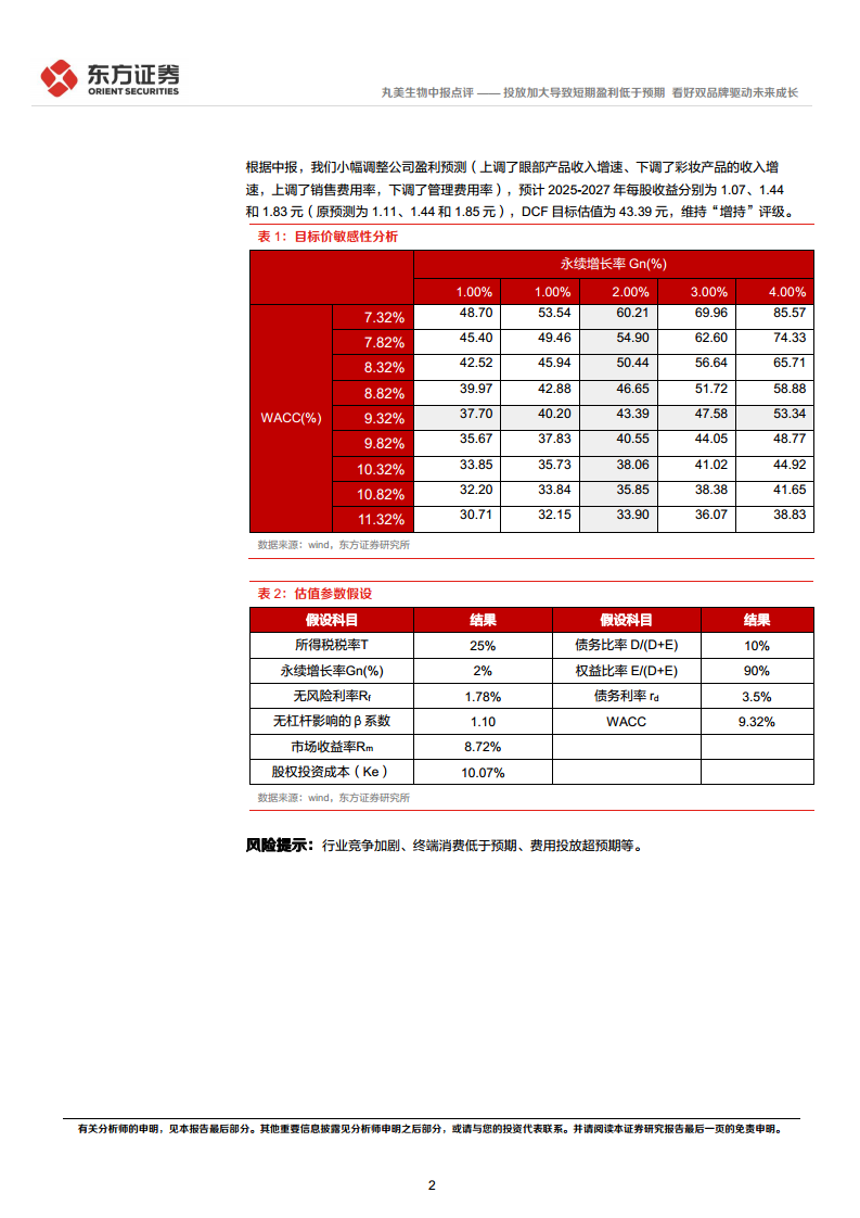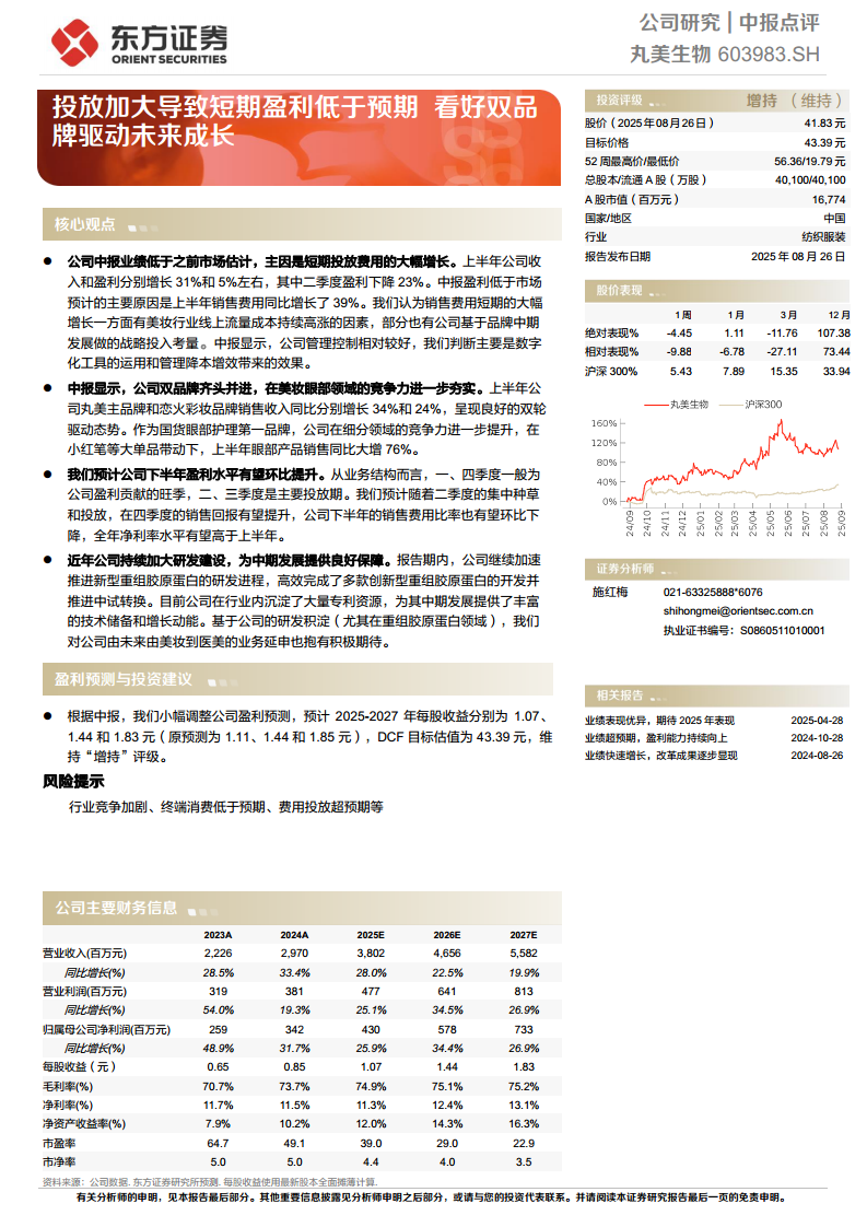 丸美生物(603983):投放加大导致短期盈利低于预期,看好双品牌驱动未来成长