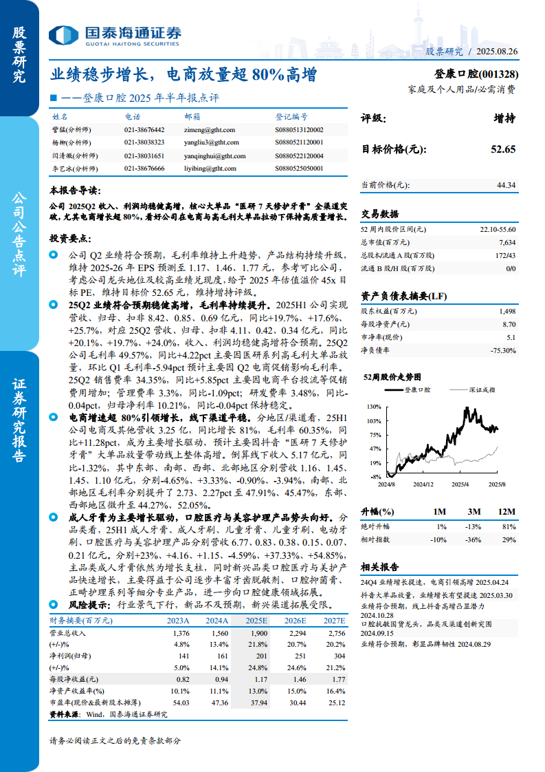 登康口腔(001328):业绩稳步增长,电商放量超80%高增