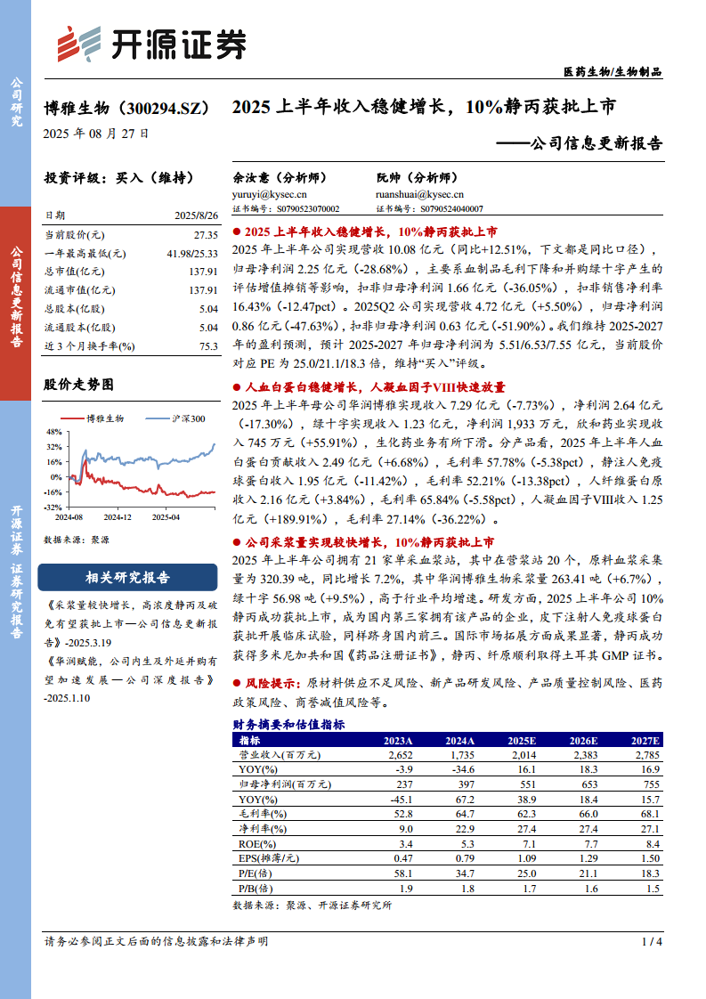 博雅生物(300294):公司信息更新报告:2025上半年收入稳健增长,10%静丙获批上市