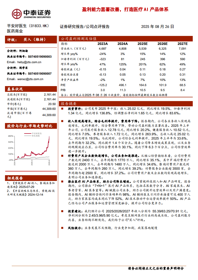 平安好医生(01833):盈利能力显著改善,打造医疗AI产品体系