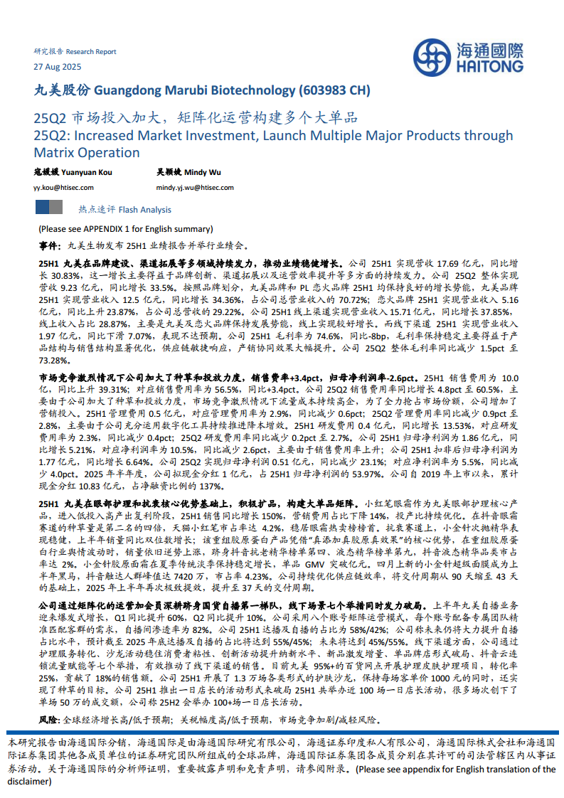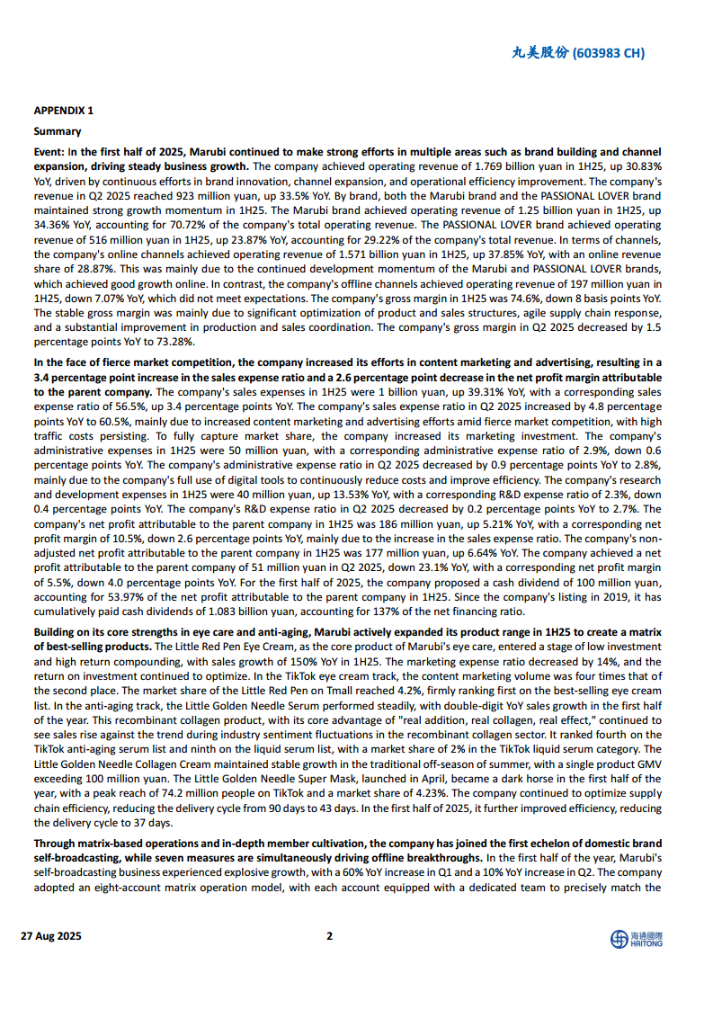 丸美生物(603983):25Q2市场投入加大,矩阵化运营构建多个大单品