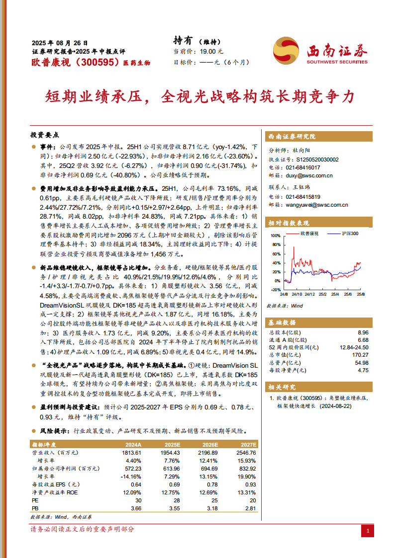欧普康视(300595):短期业绩承压,全视光战略构筑长期竞争力