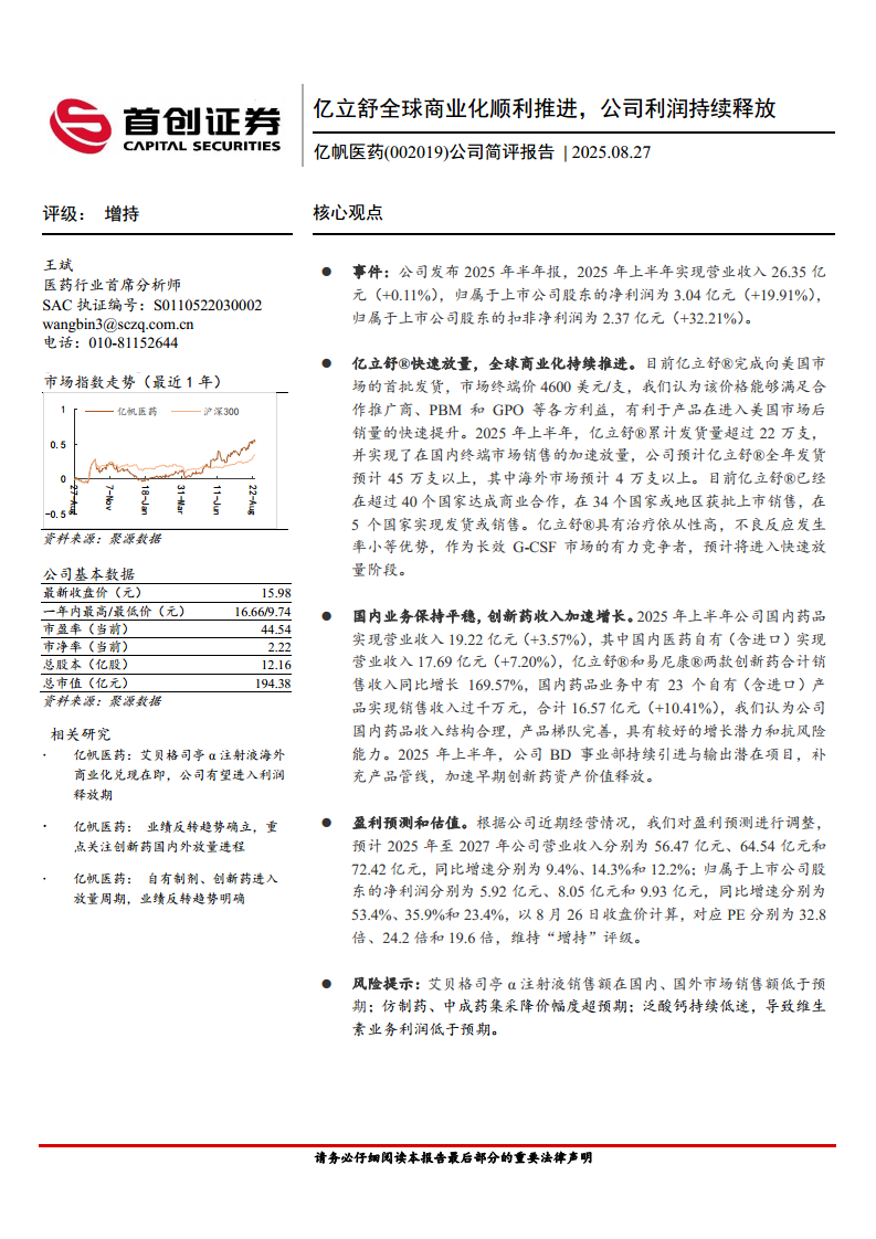 亿帆医药(002019):亿立舒全球商业化顺利推进,公司利润持续释放