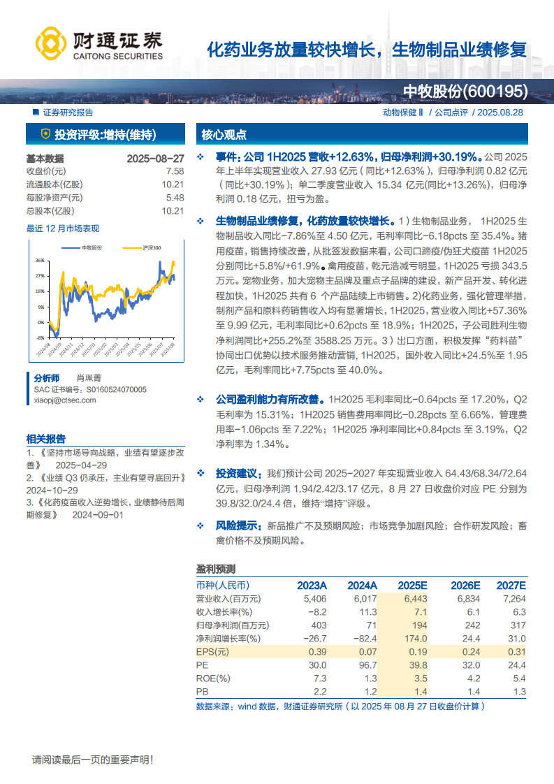 中牧股份(600195):化药业务放量较快增长,生物制品业绩修复