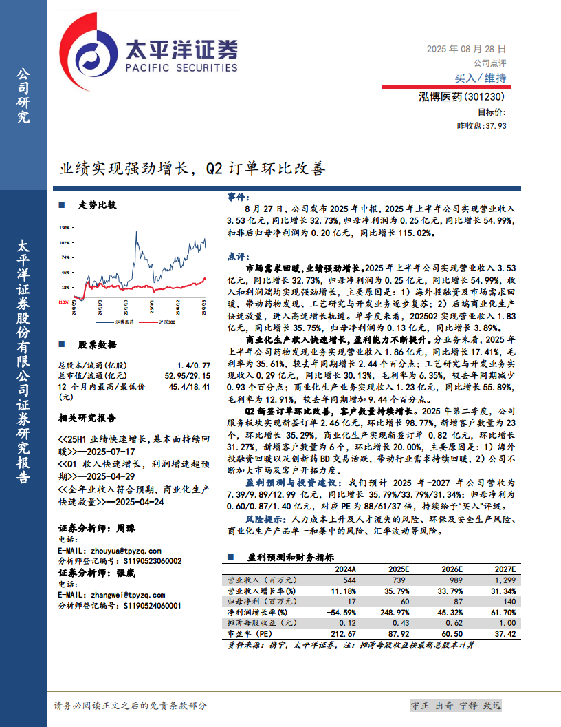泓博医药(301230):业绩实现强劲增长,Q2订单环比改善