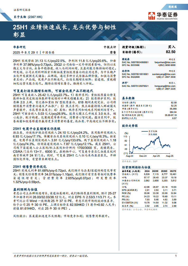 巨子生物(02367):25H1业绩快速成长,龙头优势与韧性彰显