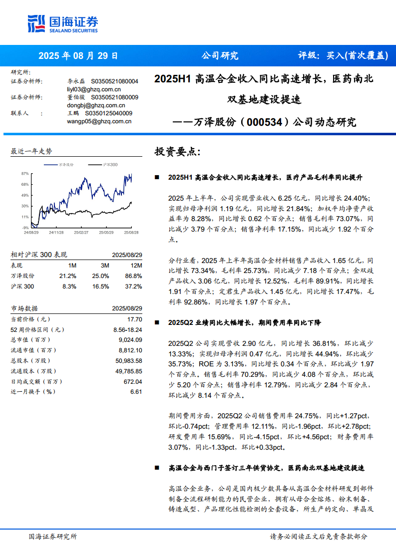 万泽股份(000534):2025H1高温合金收入同比高速增长,医药南北双基地建设提速