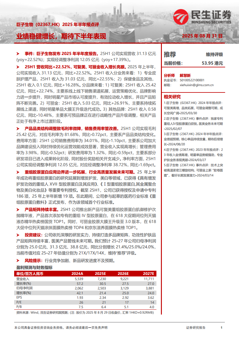 巨子生物(02367):2025 年半年报点评:业绩稳健增长,期待下半年表现