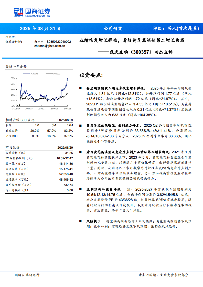 我武生物(300357):动态点评:业绩恢复增长弹性,看好黄花蒿滴剂第二增长曲线