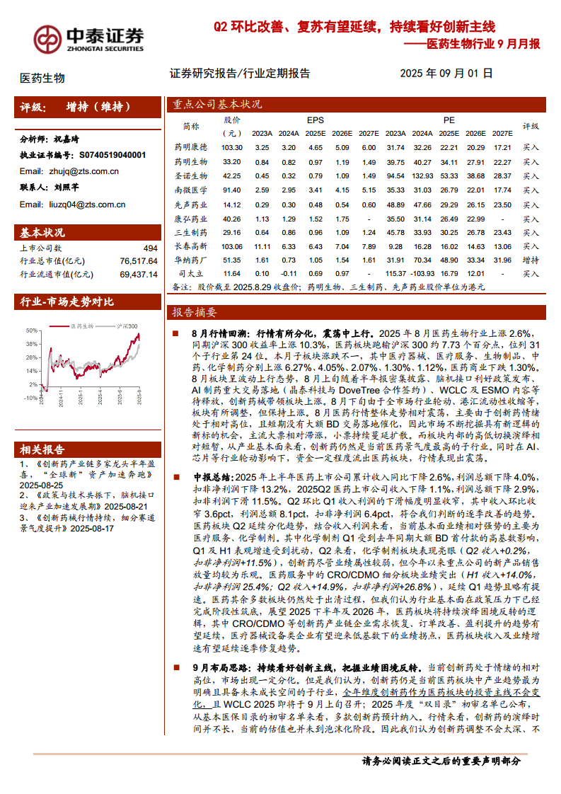 医药生物行业9月月报:Q2环比改善、复苏有望延续,持续看好创新主线