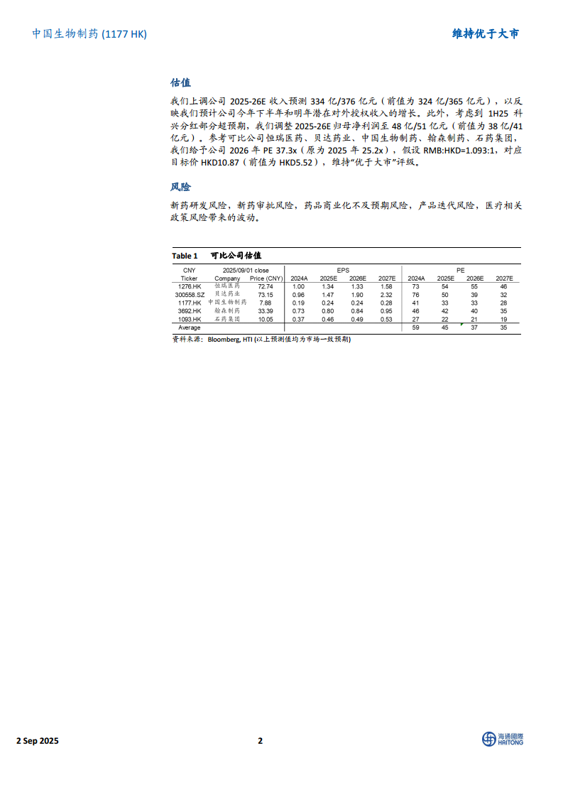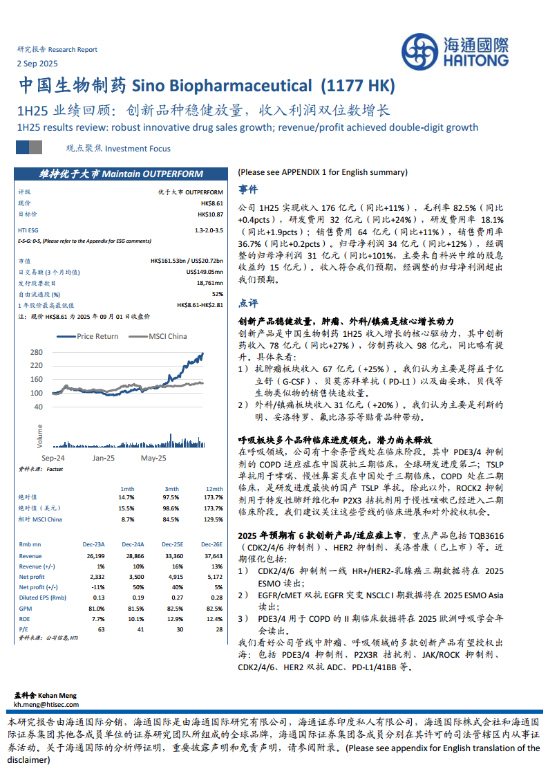中国生物制药(01177):1H25业绩回顾:创新品种稳健放量,收入利润双位数增长