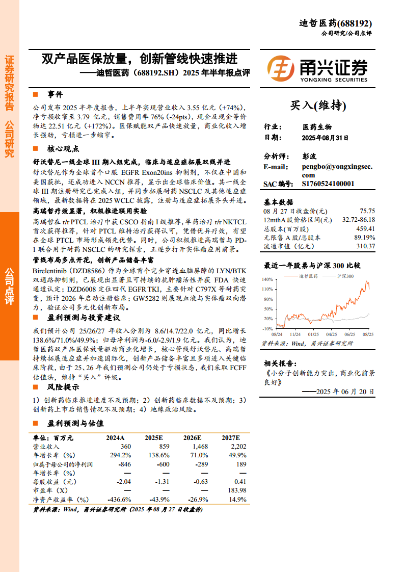 迪哲医药(688192):2025年半年报点评:双产品医保放量,创新管线快速推进