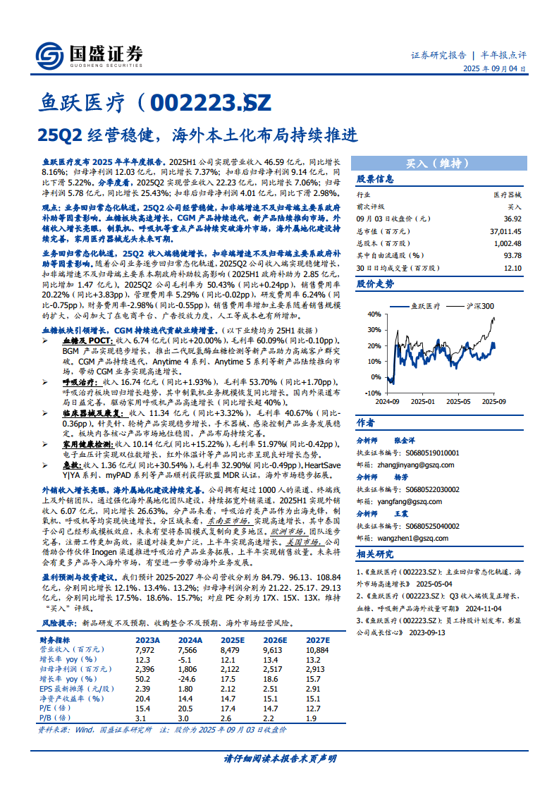 鱼跃医疗(002223):25Q2经营稳健,海外本土化布局持续推进