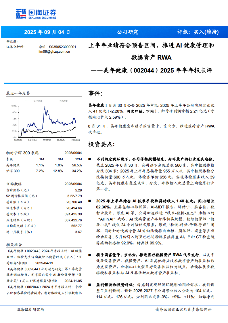 美年健康(002044):2025年半年报点评:上半年业绩符合预告区间,推进AI健康管理和数据资产RWA