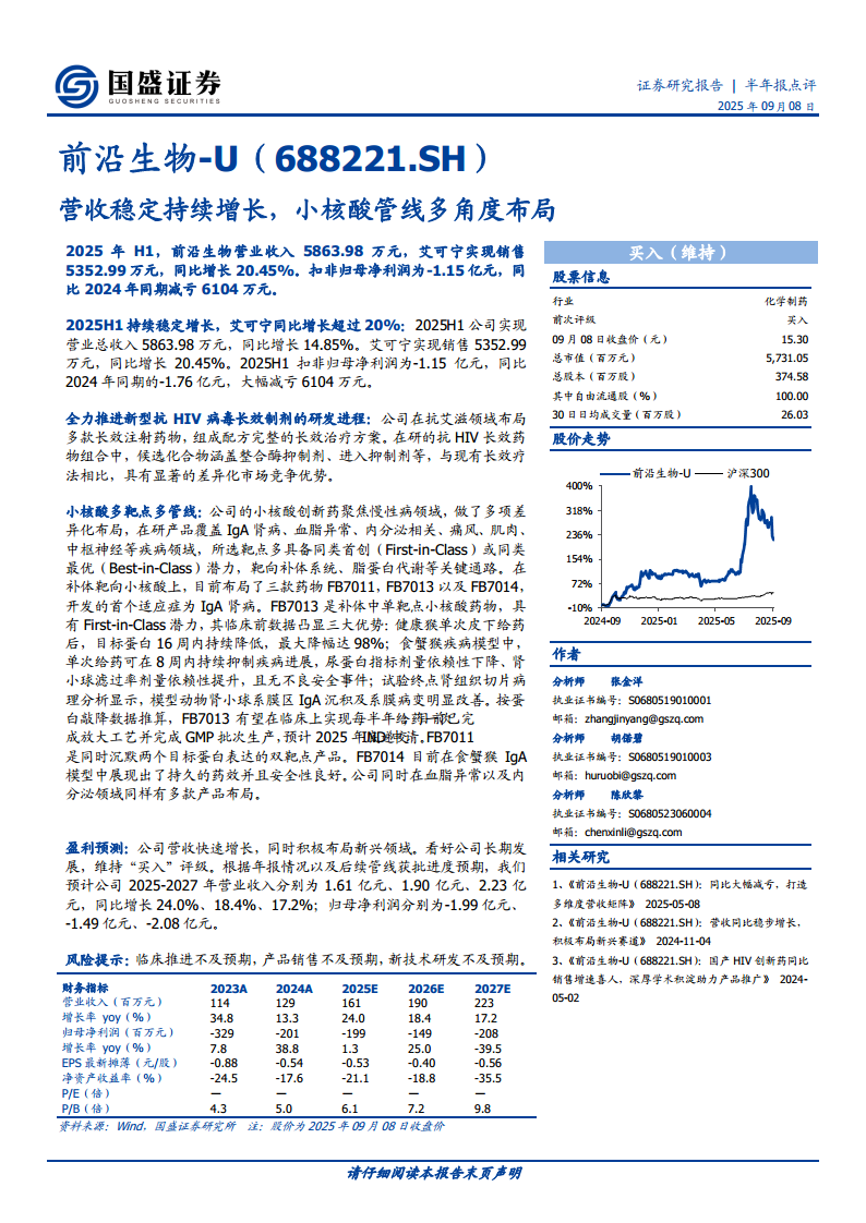 前沿生物(688221):营收稳定持续增长,小核酸管线多角度布局