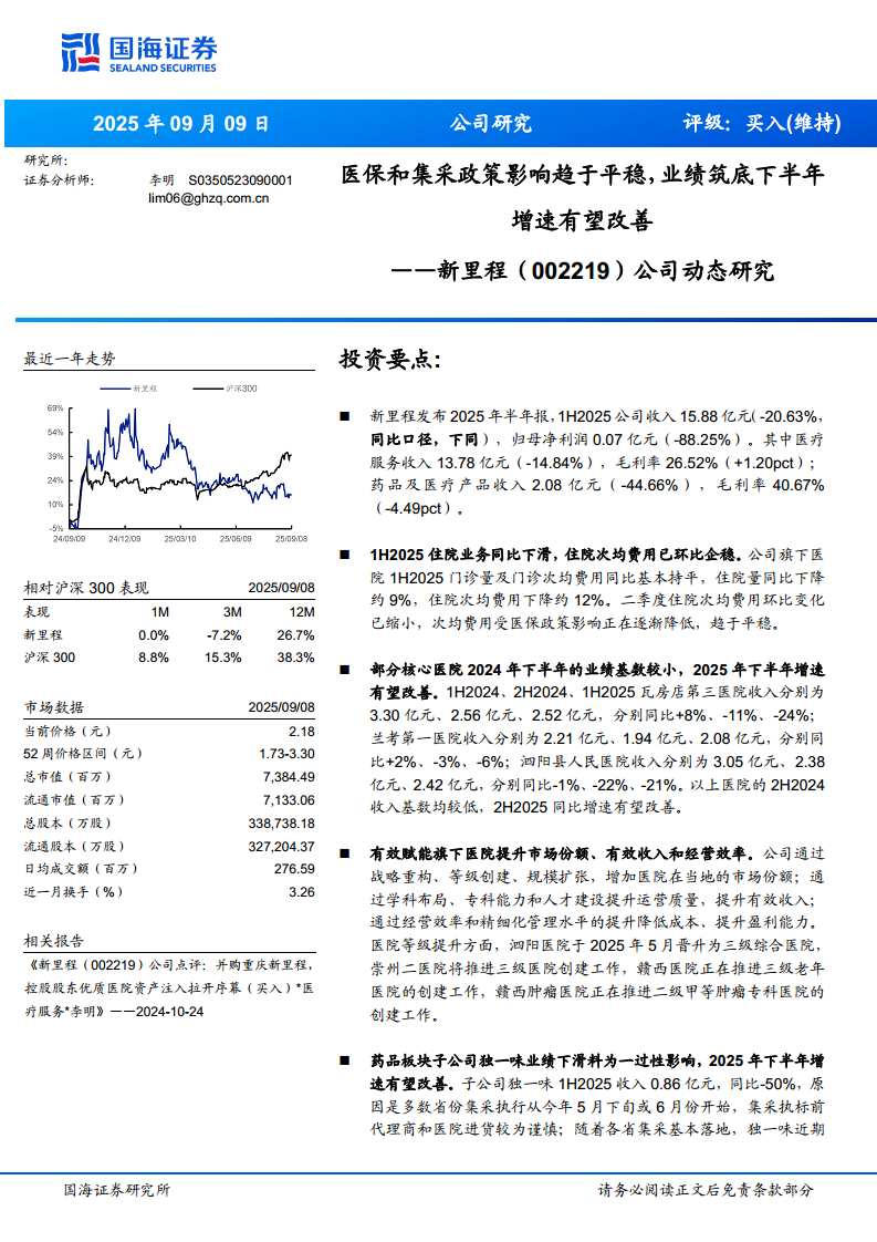 新里程(002219):医保和集采政策影响趋于平稳,业绩筑底下半年增速有望改善