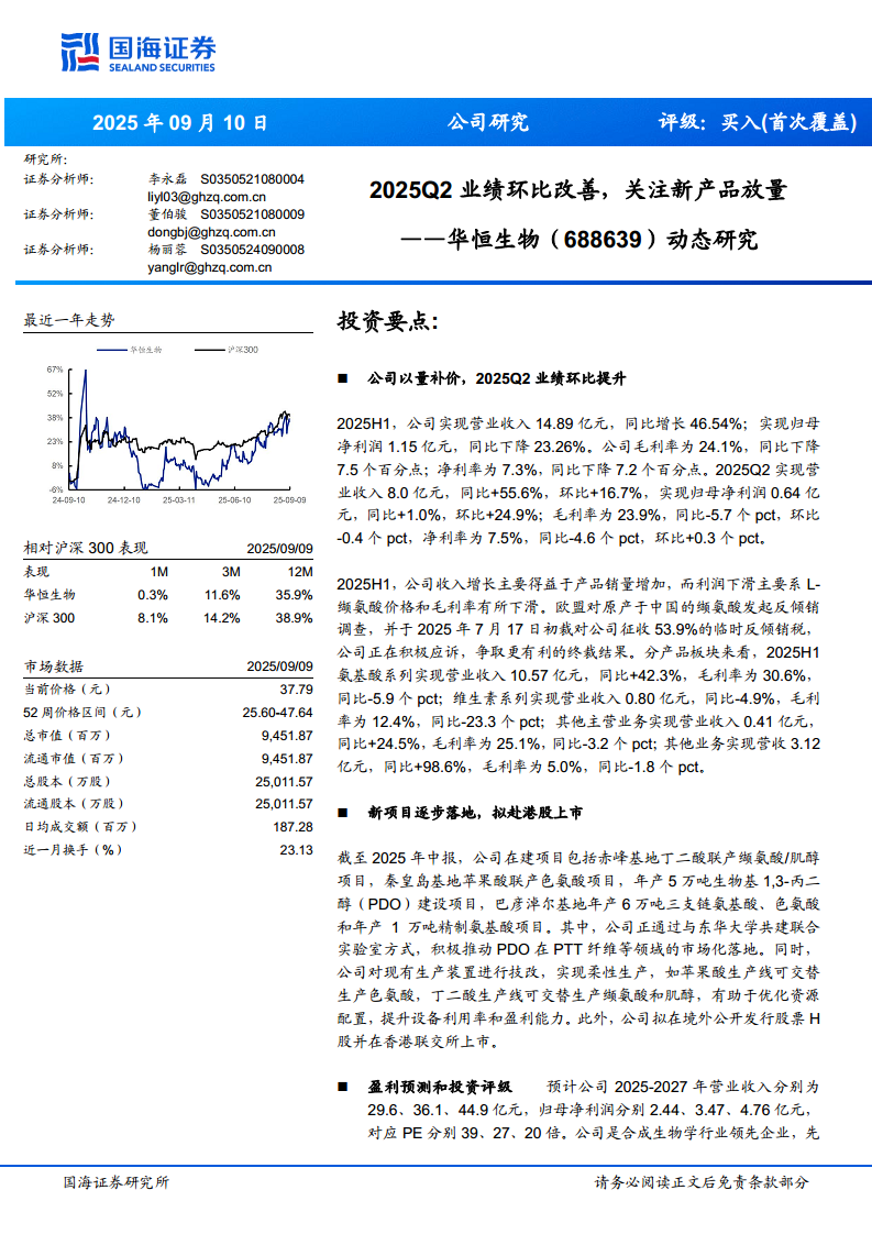 华恒生物(688639):动态研究:2025Q2业绩环比改善,关注新产品放量