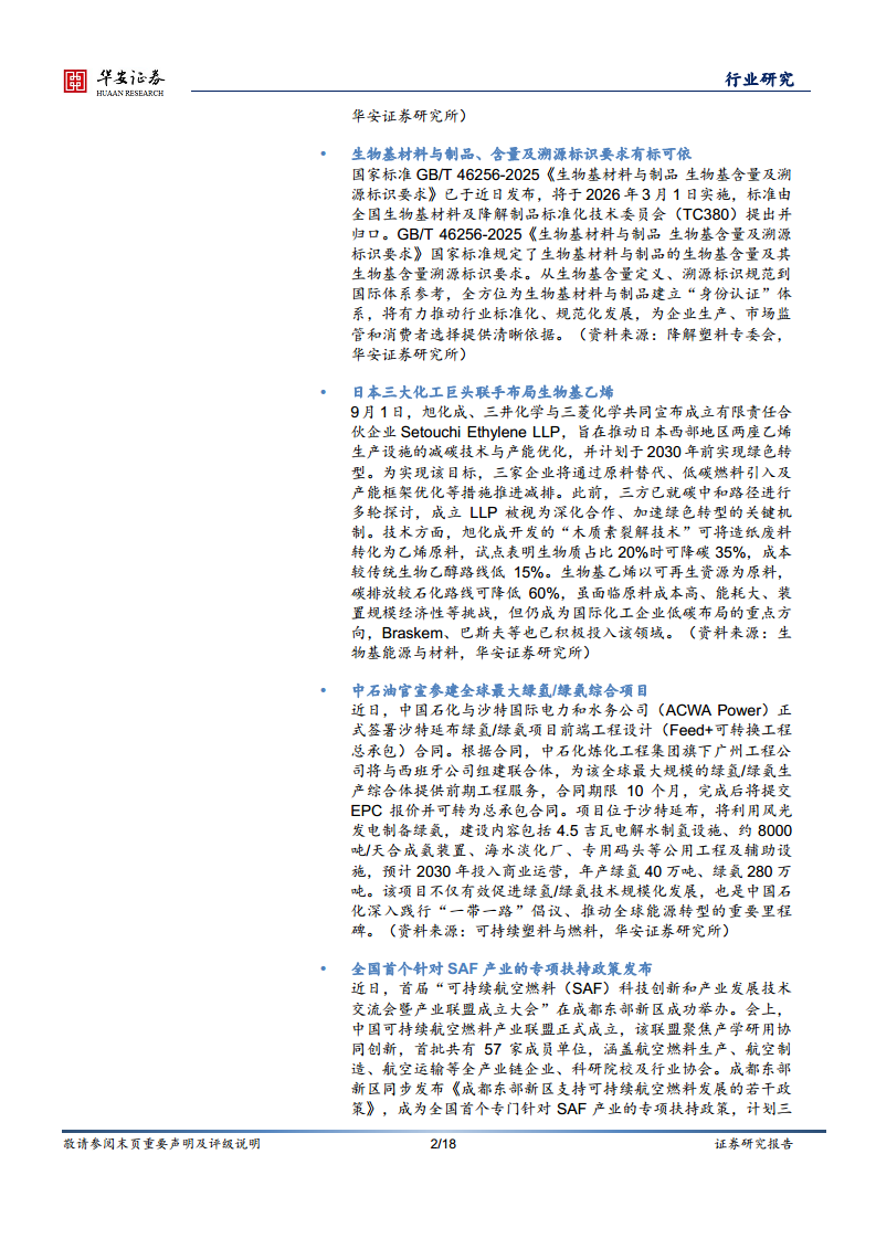 9月1日,旭化成、三井化学与三菱化学共同宣布成立有限责任合伙企业Setouchi Ethylene LLP,旨在推动日本西部地区两座乙烯生产设施的减碳技术与产能优化,并计划于2030年前实现绿色转型。为实现该目标,三家企业将通过原料替代、低碳燃料引入及产能框架优化等措施推进减排。此前,三方已就碳中和路径进行多轮探讨,成立LLP被视为深化合作、加速绿色转型的关键机制。技术方面,旭化成开发的“木质素裂解技术”可将造纸废料转化为乙烯原料,试点表明生物质占比20%时可降碳35%,成本较传统生物乙醇路线低15%。生物基乙烯以可再生资源为原料,碳排放较石化路线可降低60%,虽面临原料成本高、能耗大、装置规模经济性等挑战,但仍成为国际化工企业低碳布局的重点方向,Braskem、巴斯夫等也已积极投入该领域。(资料来源:生物基能源与材料,华安证券研究所)