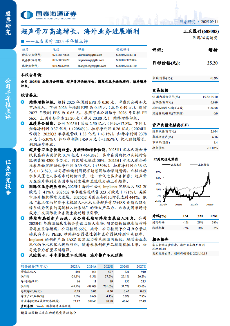 三友医疗(688085):超声骨刀高速增长,海外业务进展顺利