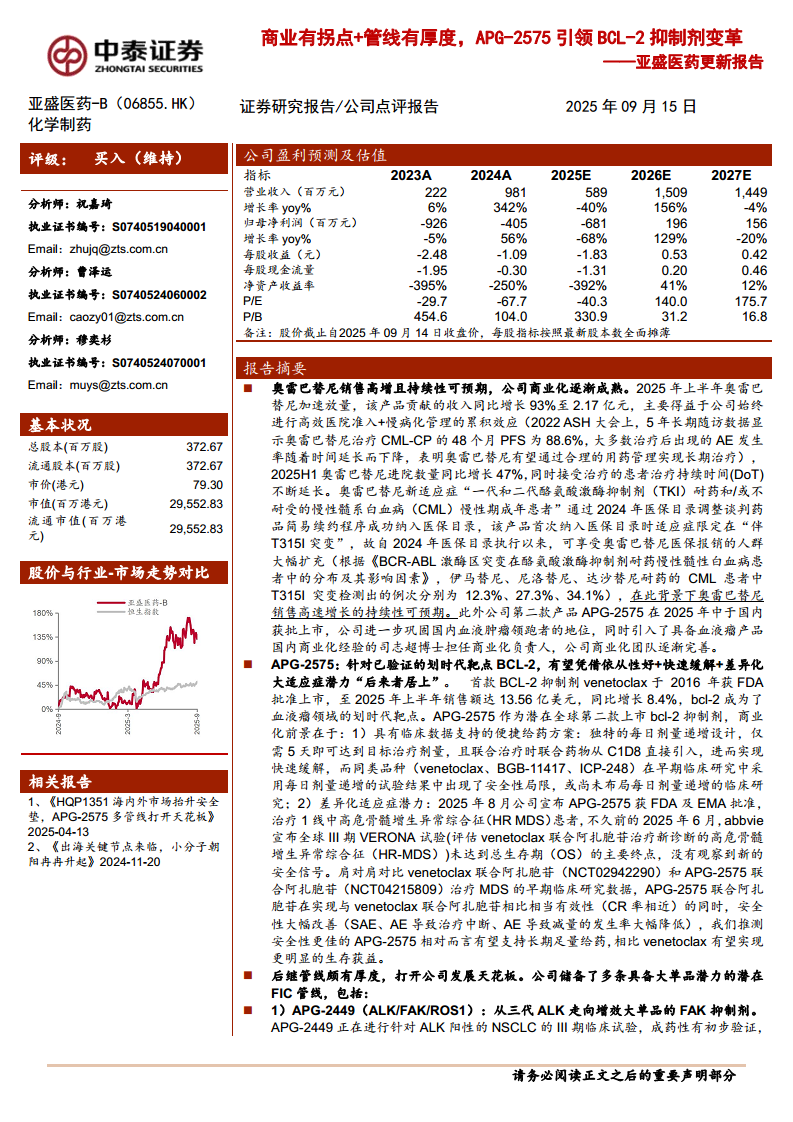 亚盛医药-B(06855):更新报告:商业有拐点+管线有厚度,APG2575引领BCL-2抑制剂变革
