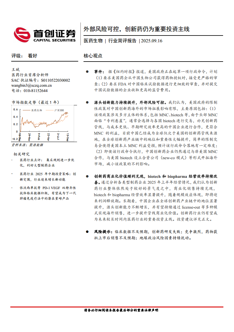 医药生物行业简评报告:外部风险可控,创新药仍为重要投资主线