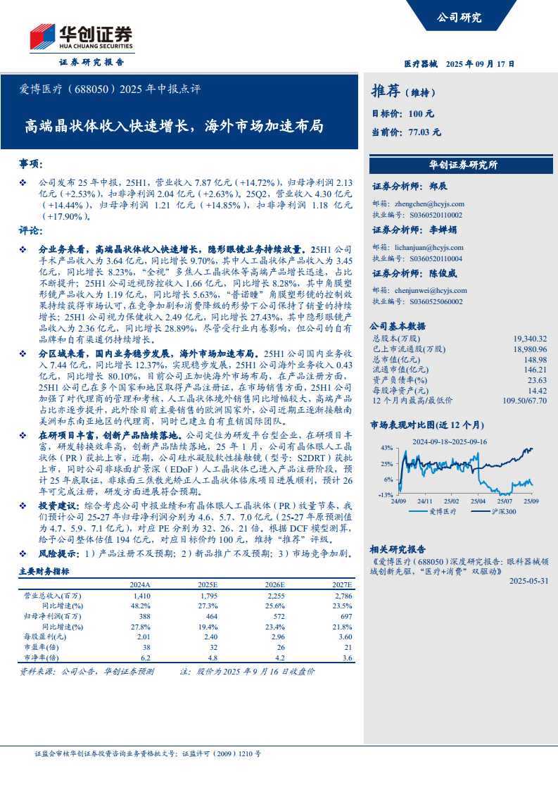 爱博医疗(688050):高端晶状体收入快速增长,海外市场加速布局