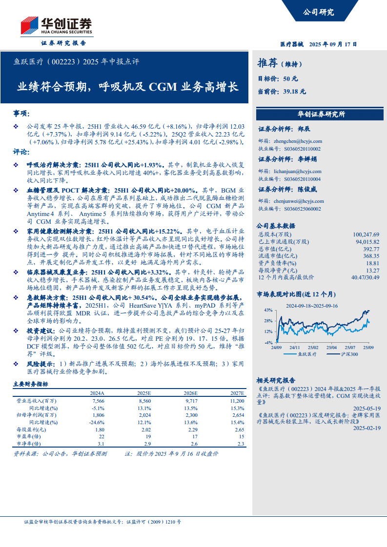 鱼跃医疗(002223):业绩符合预期,呼吸机及CGM业务高增长