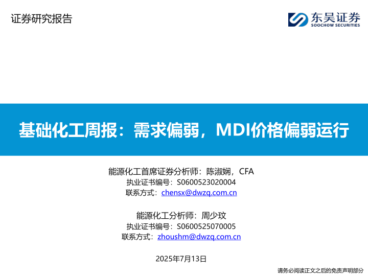 基础化工周报:需求偏弱,MDI价格偏弱运行
