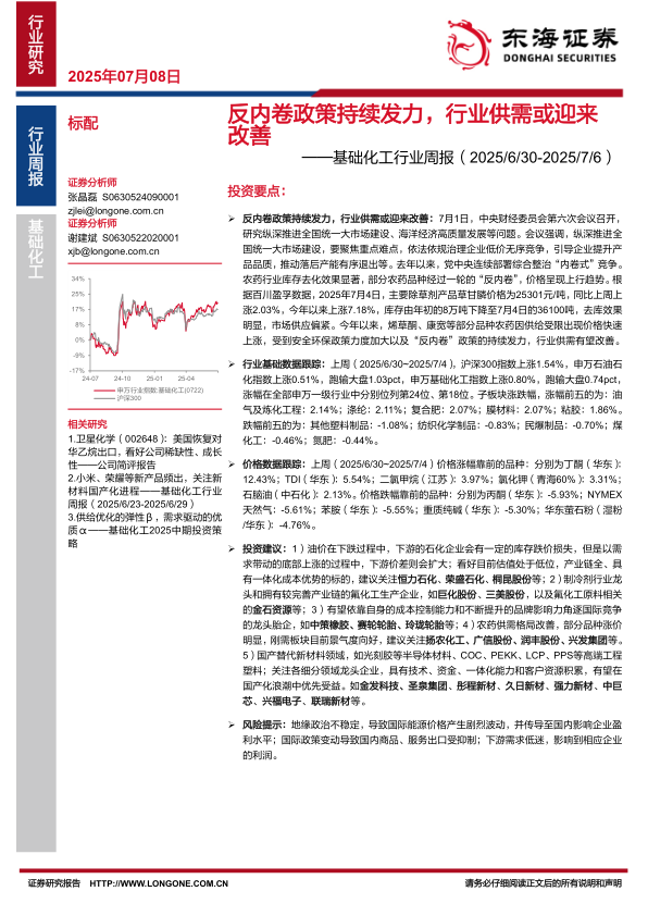 基础化工行业周报:反内卷政策持续发力,行业供需或迎来改善