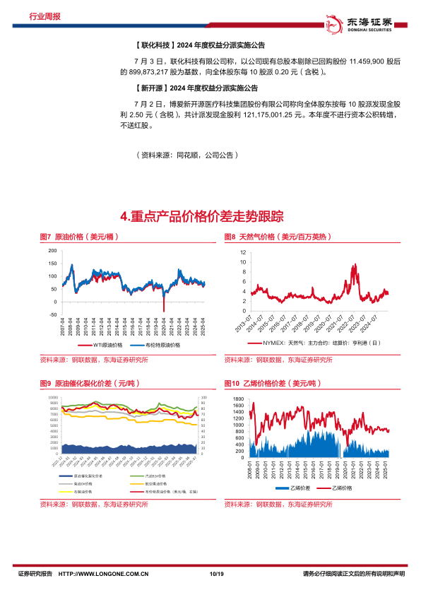 价格数据跟踪:上周(2025/6/30~2025/7/4)价格涨幅靠前的品种:分别为丁酮(华东):12.43%;TDI(华东):5.54%;二氯甲烷(江苏):3.97%;氯化钾(青海60%):3.31%石脑油(中石化):2.13%。价格跌幅靠前的品种:分别为丙酮(华东):-5.93%;NYMEX天然气:-5.61%;苯胺(华东):-5.55%;重质纯碱(华东):-5.30%;华东萤石粉(湿粉/华东):-4.76%。