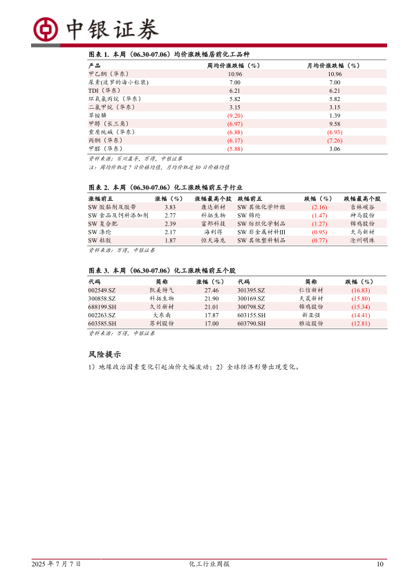 截至7月6日,SW基础化工市盈率(TTM剔除负值)为22.52倍,处在历史(2002年至今)的96.70%分位数;市净率为1.92倍,处在历史水平的46.65%分位数。SW石油石化市盈率(TTM剔除负值)为11.02倍,处在历史(2002年至今)的77.37%分位数;市净率为1.15倍,处在历史水平的47.67%分位数。今年以来,行业受关税相关政策、原油价格大幅波动等因素影响较大,七月份建议关注:1、安全监管政策、行业供给端变化等对农药及中间体行业的影响;2、上半年“抢出口”等因素带来的部分公司业绩波动;3、自主可控日益关键背景下的电子材料公司;4、分红派息政策稳健的能源企业等。中长期推荐投资主线:1原油价格有望延续中高位,油气开采板块高景气度持续,能源央企提质增效深入推进,分红派息政策稳健。油气上游资本开支增加,油服行业景气度修复,技术进步带动竞争力提升海外发展未来可期;2、下游行业快速发展,新材料领域公司发展空间广阔。一是电子材料半导体材料方面,建议关注人工智能、先进封装、HBM等引起的行业变化,半导体材料自主可控意义深远。OLED材料方面,下游面板景气度有望触底向好,建议关注OLED渗透率提升与相关材料国产替代。二是新能源材料。我国新能源材料市场规模持续提升,固态电池等下游应用新方向有望带动相关材料产业链发展。三是医药、新能源等新兴领域对吸附分离材料需求旺盛;3、政策加持需求复苏,建议关注龙头公司业绩弹性及高景气度子行业一是2025年政策加持下需求有望复苏,优秀龙头企业业绩估值有望双提升。二是配额约束叠加需求提振,氟化工景气度持续上行。三是需求改善,供给格局集中,维生素景气度有望维持高位。四是优秀轮胎企业进一步加码全球化布局,出海仍有广阔空间。推荐:中国石油、中国海油、中国石化、安集科技、雅克科技、江丰电子、鼎龙股份、蓝晓科技、沪硅产业、万润股份、德邦科技、万华化学、华鲁恒升、卫星化学、巨化股份、新和成、宝丰能源莱特光电、海油发展;建议关注:中海油服、海油工程、彤程新材、华特气体、联瑞新材圣泉集团、阳谷华泰、奥来德、瑞联新材、赛轮轮胎、玲珑轮胎、森麒麟。