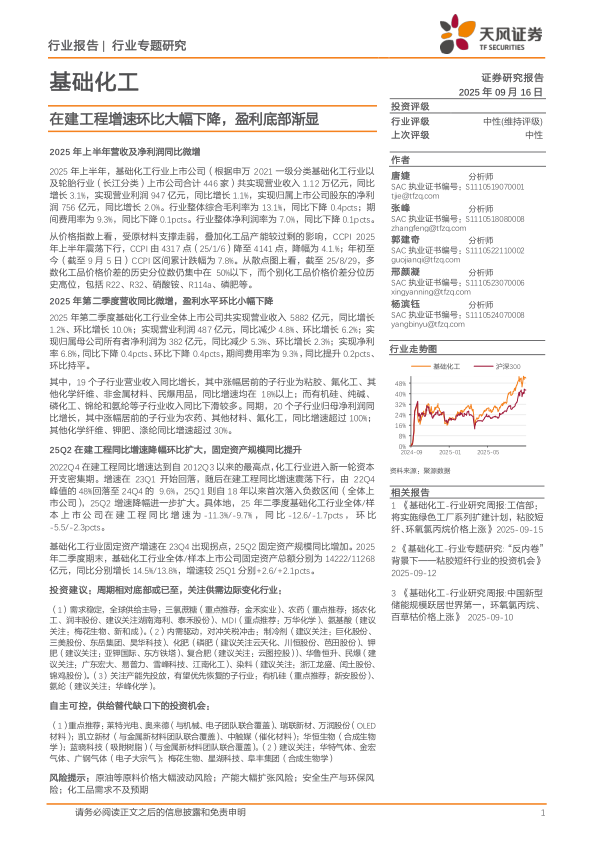 基础化工行业专题研究:在建工程增速环比大幅下降,盈利底部渐显