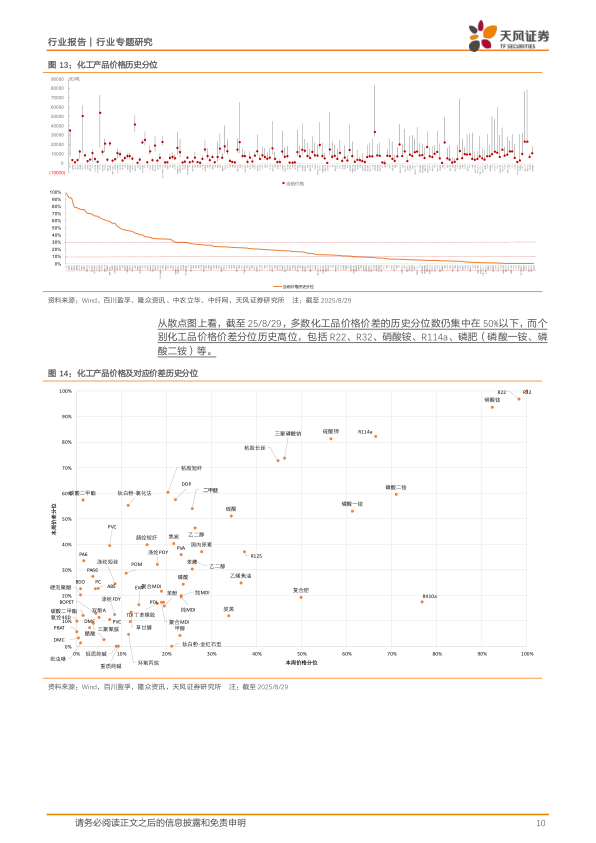 从价格指数上看,受原材料支撑走弱,叠加化工品产能较过剩的影响,CCPI2025年上半年震荡下行,CCPI由4317点(25/1/6)降至4141点,降幅为4.1.%;年初至今(截至9月5日)CCPI区间累计跌幅为7.8%。从散点图上看,截至25/8/29,多数化工品价格价差的历史分位数仍集中在50%以下,而个别化工品价格价差分位历史高位,包括R22、R32、硝酸铵、R114a、磷肥等。
