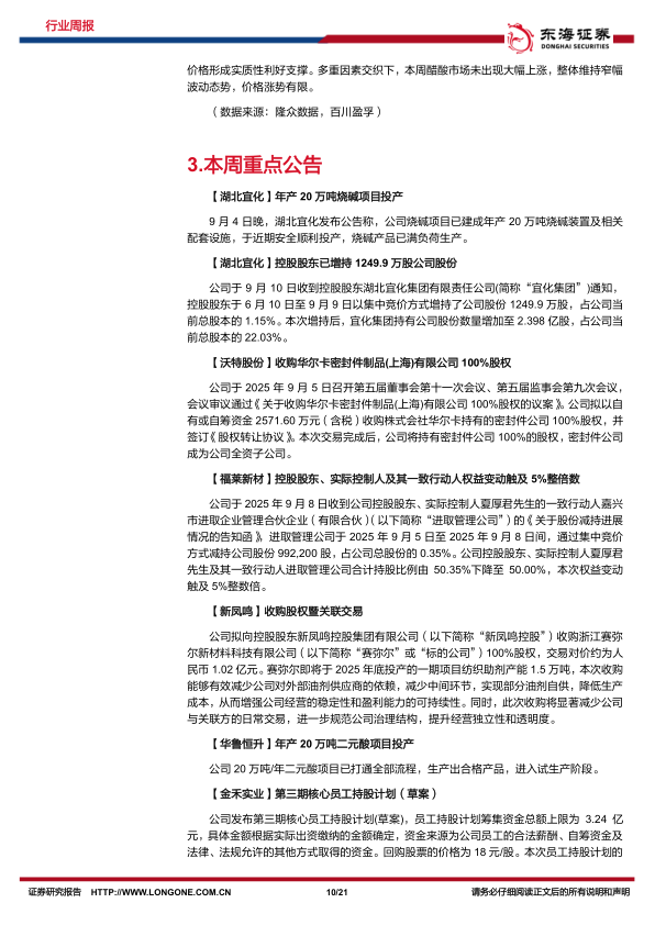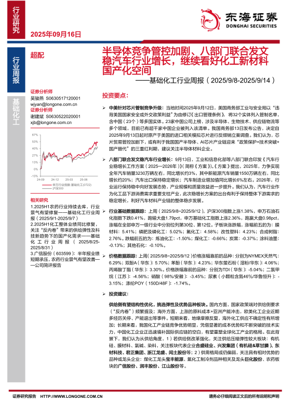 八部门联合发文稳汽车行业增长:9月13日,工业和信息化部等八部门联合印发《汽车行业稳增长工作方案(2025—2026年)》(简称《方案》)。《方案》提出,2025年,力争实现全年汽车销量3230万辆左右,同比增长约3%,其中新能源汽车销量1550万辆左右,同比增长约20%;汽车出口保持稳定增长;汽车制造业增加值同比增长6%左右。2026年,行业运行保持稳中向好发展态势,产业规模和质量效益进一步提升。我们认为,汽车行业作为化工品下游消费需求重要支柱产业,此次稳增长方案的出台有利于保持整体下游需求的稳定增长,利好汽车材料产业链的整体稳步发展。