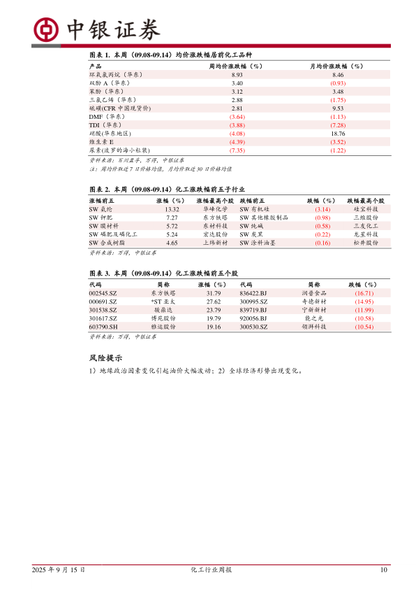 本周(09.08-09.14)均价跟踪的100个化工品种中,共有36个品种价格上涨,36个品种价格下跌,28个品种价格稳定。跟踪的产品中41%的产品月均价环比上涨,47%的产品月均价环比下跌12%的产品月均价环比持平。周均价涨幅居前的品种分别是环氧氯丙烷(华东)、双酚A(华东)苯酚(华东)、三氯乙烯(华东)、硫磺(CFR中国现货价);周均价跌幅居前的品种分别是尿素(波罗的海小粒装)、维生素E、硝酸(华东地区)、TDI(华东)、DMF(华东)。