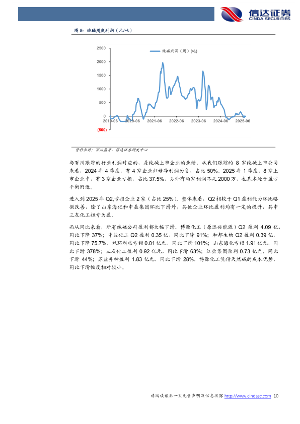 纯碱大幅下行,行业承压:2021年10月重质纯碱价格达3681元/吨高点后,受新产能投产等因素影响,2023年Q4开启新一轮下行周期。截至2025年8月,重质纯碱价格降至1335-1349元/吨区间,轻质纯碱降至1213-1257元/吨区间。价格下行导致行业利润转负,2024年9月纯碱行业利润首次转负,2025年7月再次转负;上市企业业绩大幅下滑,部分企业陷入亏损。2024年Q450%(4/8家)上市企业归母净利润为负,2025年Q1亏损占比37.5%(3/8家),2025Q2亏损25%,从同比来看业绩都大幅下滑。2025年8月15日全国纯碱工厂库存167万吨,虽较2月184万吨略有下降,但仍处历史高位,行业开工率从2025年4月近90%降至8月80%左右,去库效果有限。